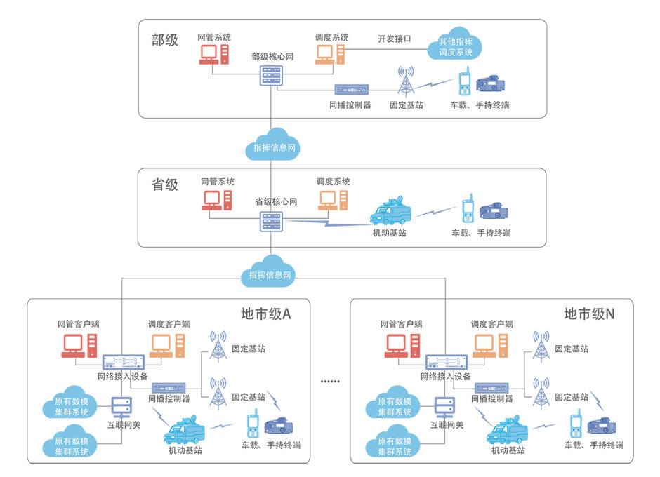 针对应急管理部门的业务特点,在370MHz PDT数字集群系统的基础上,扩展公网集群系统服务能力,实现了PDT和公网集群的系统级互通,能够在统一编组、统一定位的基础上完成音视频通话、紧急呼叫、短消息等业务,满足日常和应急情况下应急指挥调度需求,进一步提升应急指挥通信保障能力。