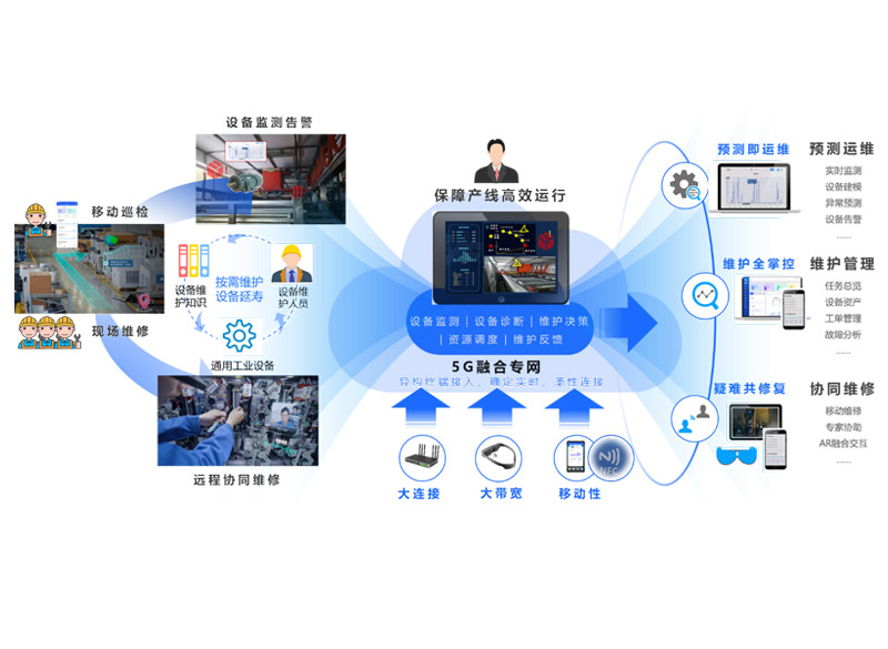 以设备维护要素为核心,以5G融合专网能力为底座,打通设备监测、诊断、决策、执行和反馈的业务链条,实现设备按需维护、设备寿命延长、产线高效运行的目标。构建自动采集和人工移动采集多元采集方式,对通用工业设备开展多域多维特征提取和数字建模,智能分析设备健康状况并进行异常预警,利用远程协作、数字工作流等手段赋能设备维护人员高效运维。
